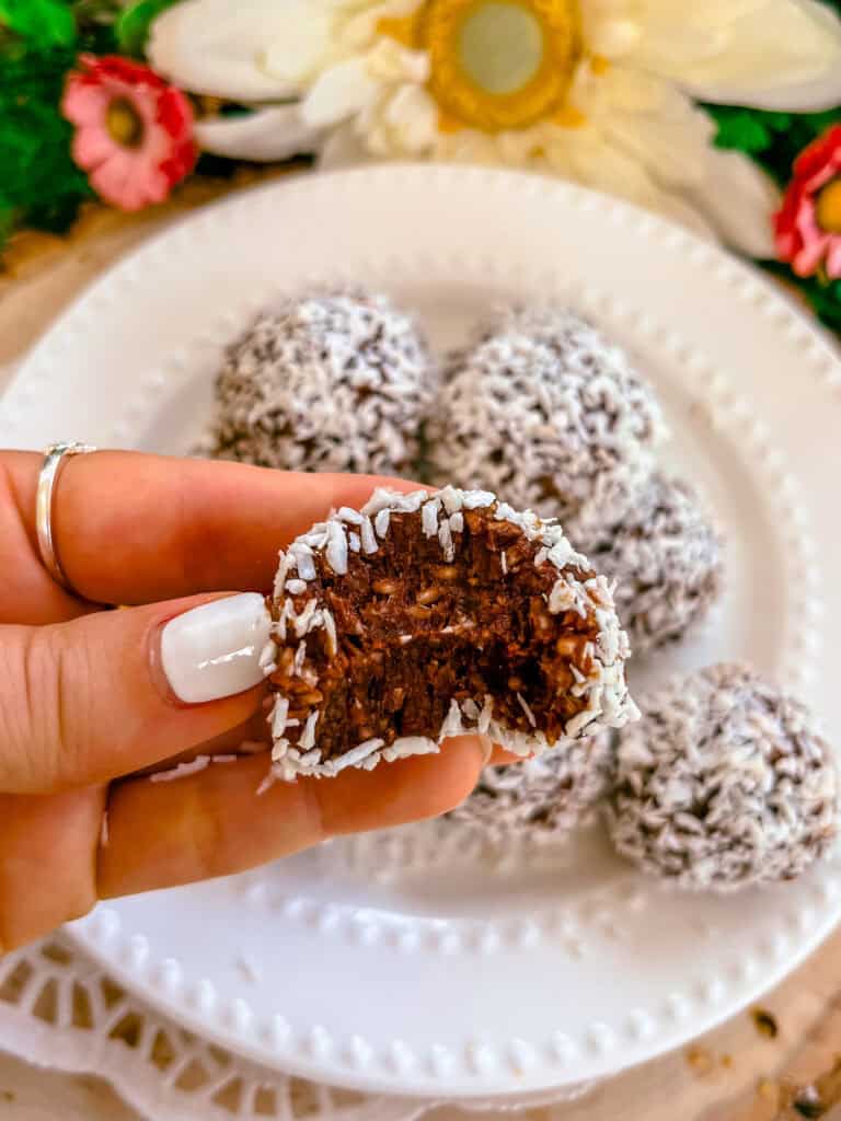 - Begin rolling into bites. Roll each bite in shredded coconut and place on the prepared baking sheet. Place the bites in the freezer to set for about 30 minutes before enjoying!