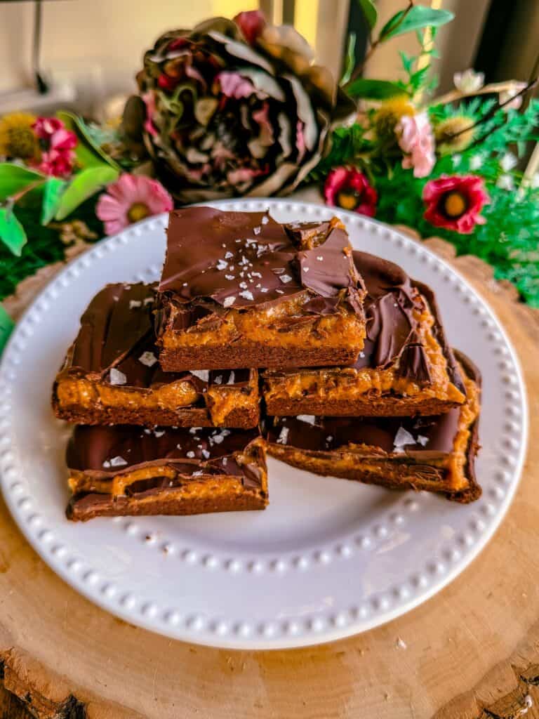 - Melt the chocolate chips until smooth and spread evenly over the caramel layer. Let harden before slicing and enjoying!
