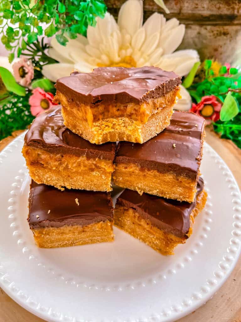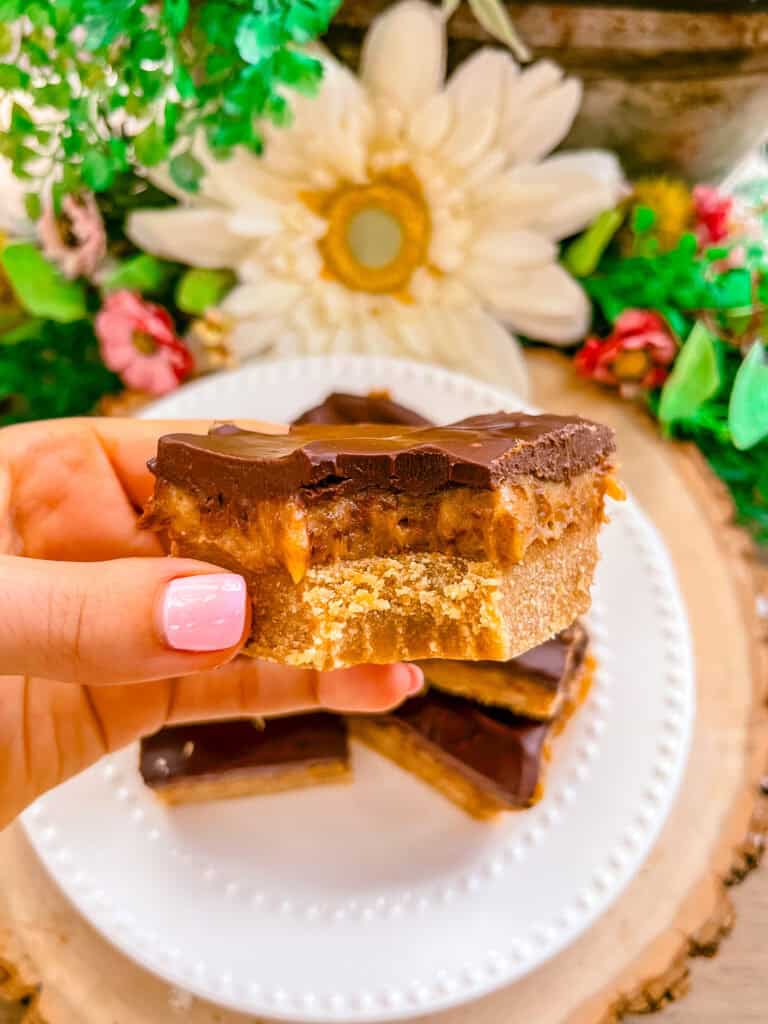 - In a microwave safe bowl, melt together the chocolate chips and coconut cream until smooth. Spread this evenly over the filling and let set before slicing and enjoying!