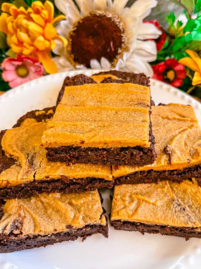 - In a separate bowl, mix together the peanut butter filling. Spread this evenly over top of the brownie layer and bake for about 15 minutes. Let cool before slicing and enjoying!