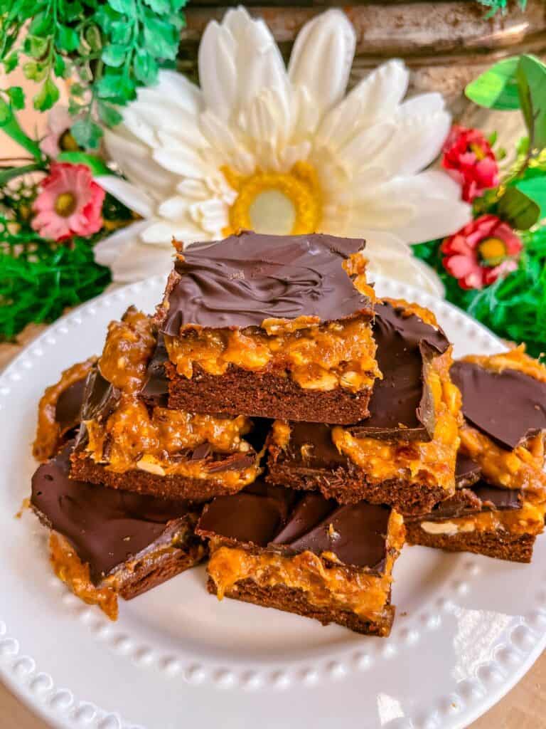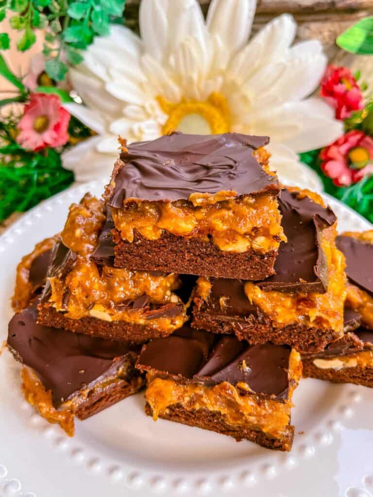 - Melt the chocolate chips and spread the melted chocolate evenly over the peanut butter caramel layer. Return to the freezer to set for another 20-30 minutes. Slice into brownies and enjoy!